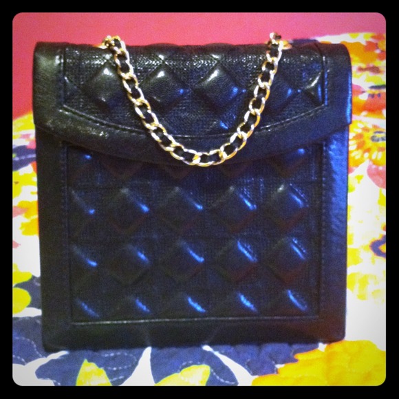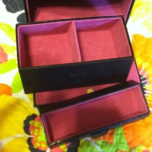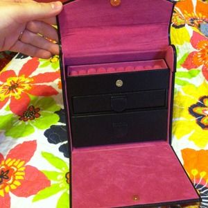 Black quilted pattern. Gold chain. Hot pink inside. 2 pull outs and a ring/ earring holder.