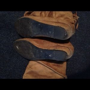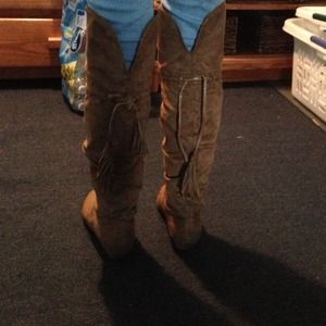 Brown suede material knee high boots. They have a slight wedge on them, probably about an inch. They were pre loved and do have signs of wear, which reflects the price. Their from shoe dazzle, bought just this past fall season. Look super cute with jeans or leggings!
