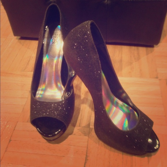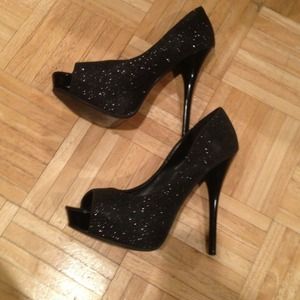 Hot hot hot black pumps!!! Black open toe pump with about a 1 inch platform and about a five inch heel. Worn a couple of times definite show stoppers!! No box.