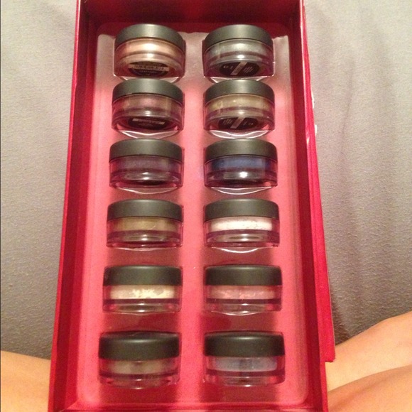 12 different colors of eye shadows by bare Escentuals. Never been used just opened to see the colors.