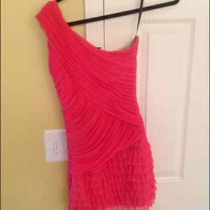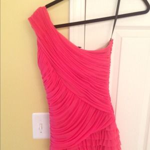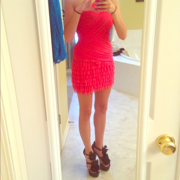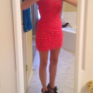 Fun and flirtatious! Bebe dress worn once..great for parties or a night out with the girls! Ruching on the top defines natural waist while layered bottom swishes flirtatiously :) pleas don't hesitate to ask questions! Shoes listed separately but will bundle for discount!