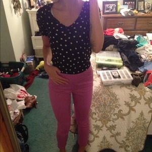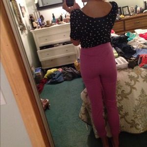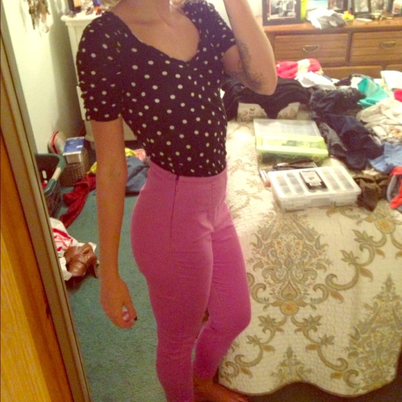 Magenta high waisted stretchy pants with side zipper, paired with a sweetheart neckline polka dot blouse. either item can be sold alone by request!