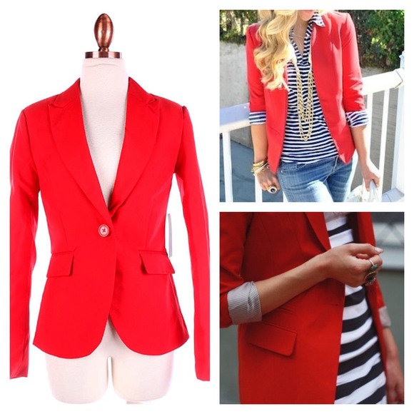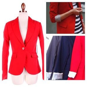 NWT. Red Blazer. One Button. Sleeves can be cuffed and have stripes on the inside. Available in SML.