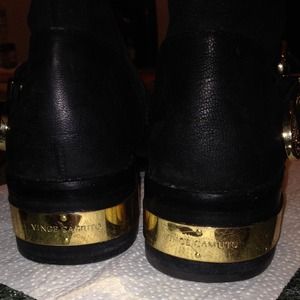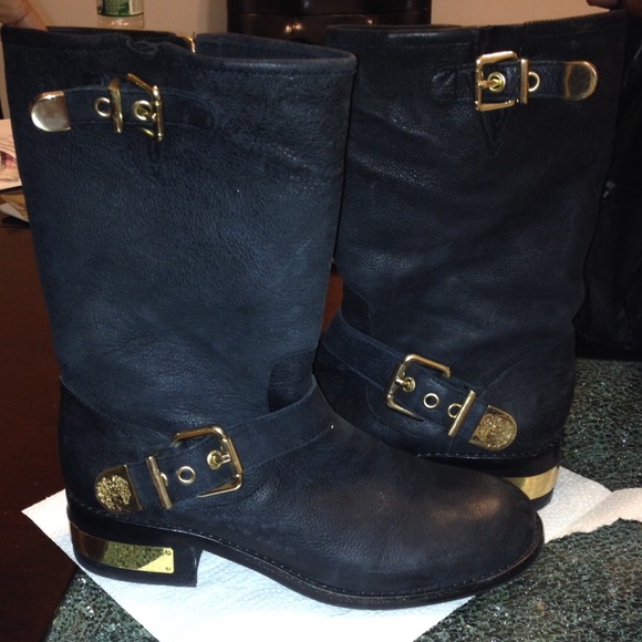 Black biker Bootie with gold detailing. I've worn these booties about 4 times. They are coming off dull on camera out they aren't and will be polished before shipping.