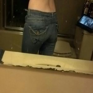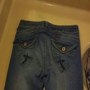 Yellow and red stitching light and dark fade jean. Five pocket. Tag states size nine. I'm a 2 and they fit perfectly...front right belt loop is ripped but no hole In Jean. Will be fixed professionally before purchase.
