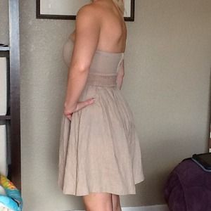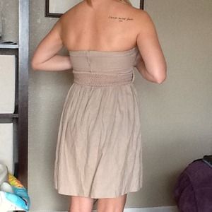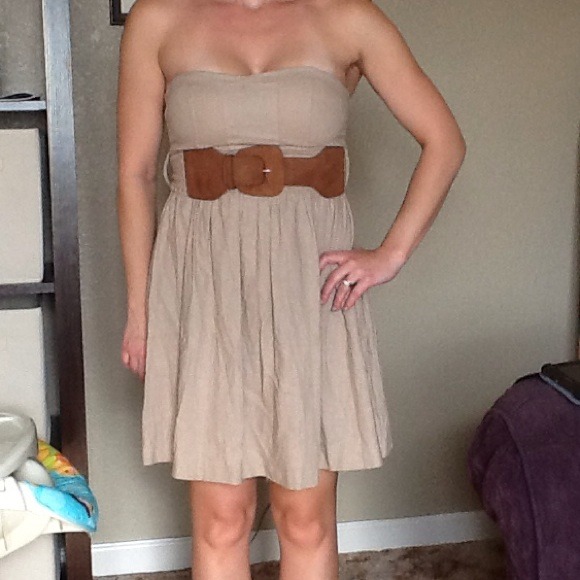 Tan strapless dress with zip back closure. Belt included. Dress up with heels or down with sandles. Lined top.