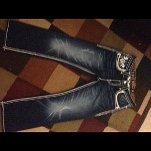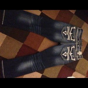 They are BRAND NEW rock revivals never been worn got them for my boyfriend and he said he liked them but they were too big and he never told me so I took off the tags but they were too big! There very nice, dark wash, they look even better in person too!
