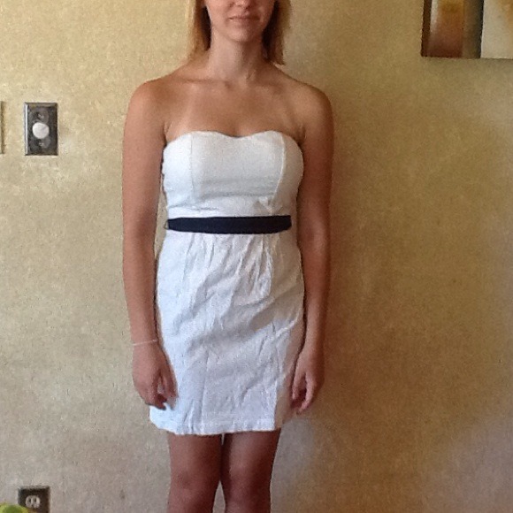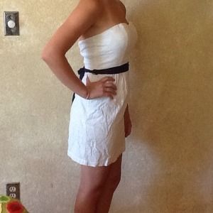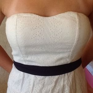 100% cotton dress. Fully lined strapless dress with sweet heart neckline. Has eyelet pattern and blue ribbon accent. Great for the summer!