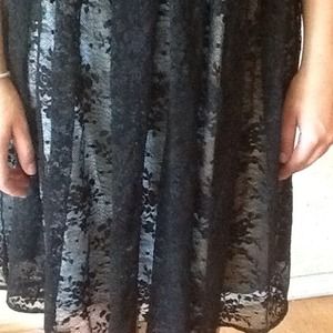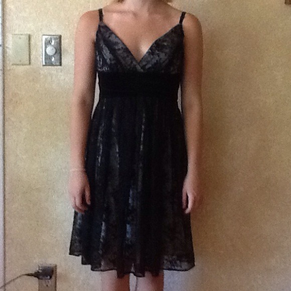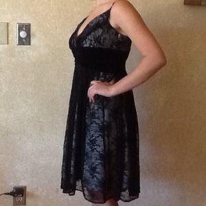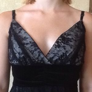 V neck spaghetti strap dress. Light grey liner with a lace over lay. Empire waist with velvet detail.