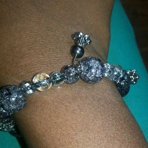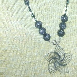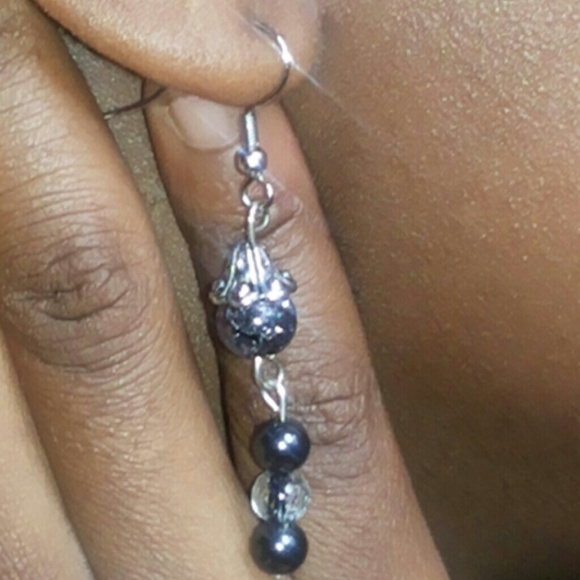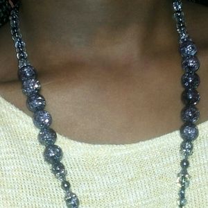 The necklace is a reverse style 28 inches long with the closer being at the bottom with the pendent. The bright silver shine catches the crackle beads beautifully. The bracelet stretchy and the earrings are 2 1/2 inch dangle.