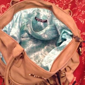 Gently used,light brown, 1 inner pocket and 1 on each outer side 1 under logo behind tassels look alike leather
