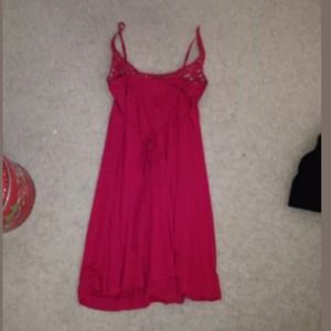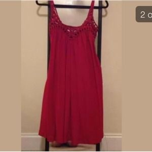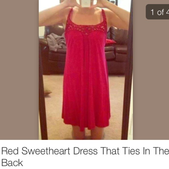 Red dress that ties in the back with a sweetheart neckline. Adjustable straps. Free-flowing and very flattering!
