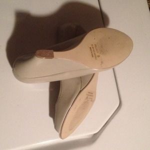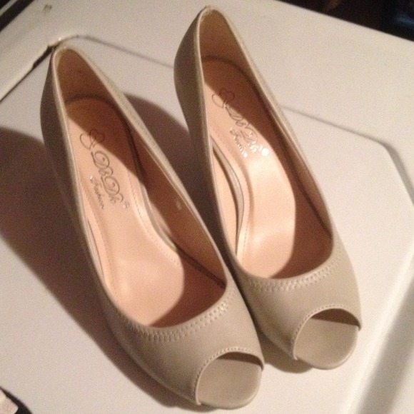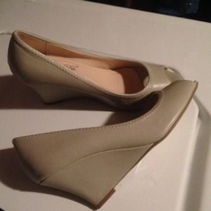 Beige peep-toe wedges. These have never been worn (other than a few times trying them on inside the house, but never actually worn). They are faux "leather" all over and have an a 3 inch heel. These are a size 9 and are true to size, however being that they are a peep-toe heel I would recommend them for someone who wears an 8 1/2. Please let me know if you have questions!