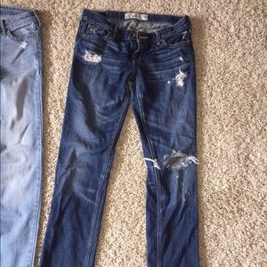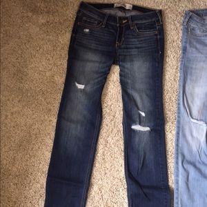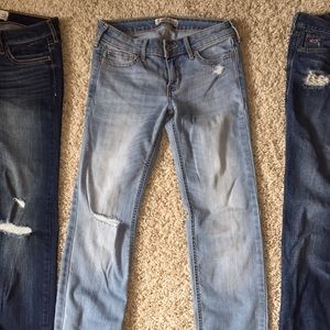 3 pairs of hollister jeans! The pair on the left have never been worn And are a size 3R ( w26 L 32). The pair in the middle have never been worn and are a size 3R(w26 L32). The pair on the right are worn but have love left in them. They are a size 3R ( W26 L33).