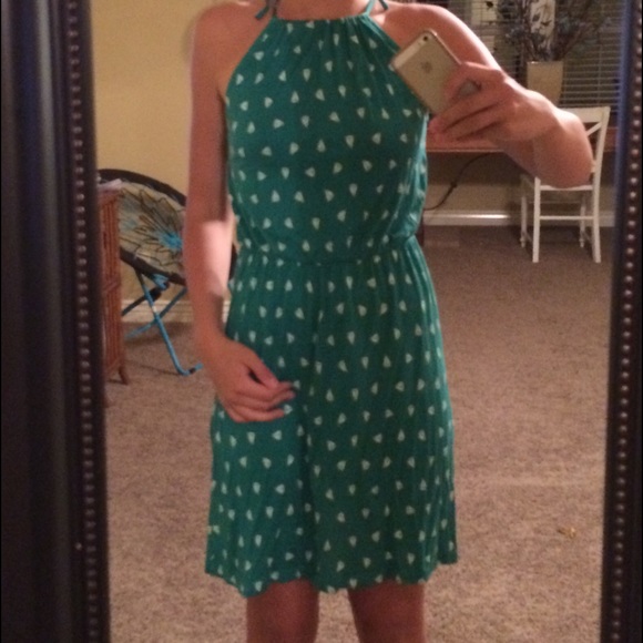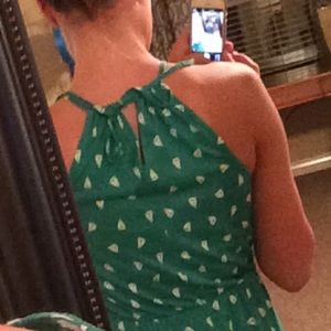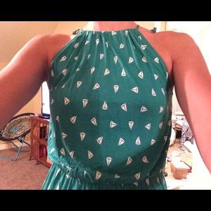 Cute emerald green dress with white sailboat pattern, cinched waist, adjustable halter type style that ties in the back