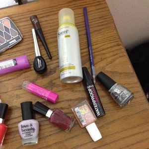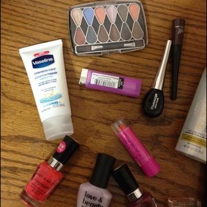 Mostly new or gently used make up and nail polish. Includes 5 nail polish, 3 eyeliners, one mascara, 2 lipsticks, an eyeshadow pallet, dry-conditioner, and small lotion.All offers considered and I do trade.