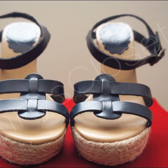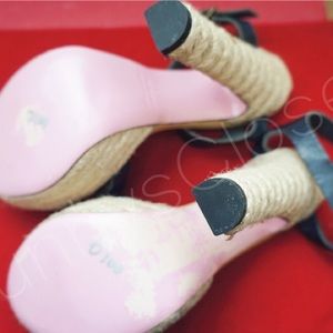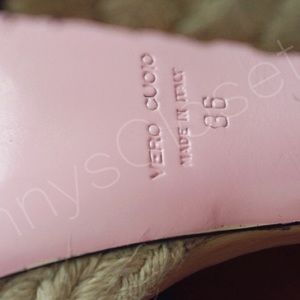 Cute high heel sandals from red Valentino, with super soft blue leather top and espadrille bottom, 6" heels including platform. Shoes are 36 and should fit 5.5-6, I'm a 6 and prefer not to let my sandal protrude from my heel :) these are new never worn heels but they show wear from storage and handling, the back strap are a bit wrinkled and there are some tiny specks on front leather in pic 2, some pink are also missing on the soles, and little spots of color transfer on heels, nothing major.