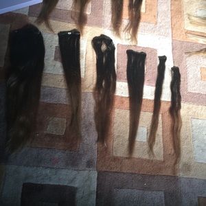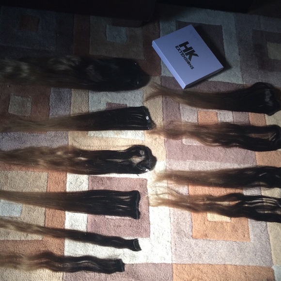 HK extensions in "oh my ombré". This set is 20 to 22 inches long and weigh 220 grams! Worn only twice and washed them. 100% human hair and great quality! The ombré is so pretty and natural looking. Comes with 10 pieces! 1 four clip weft, 2 three clips wefts, 5 two clips wefts and 2 one clip wefts. Bought them only a month ago for $240!
