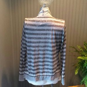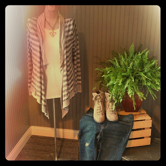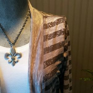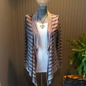 Cute distresses striped shrug. It's a junior size large. I'm a medium or an 8 and it fits me perfectly.
