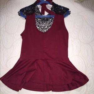 Ruffled vintage lace top. Lace runs up to color bone giving it you a sexy touch. Ruffled bottom flares open so it can be worn with skirts or high waist pants to give a classy touch. Tie up at the back with scooped open back to reveal some of your back. **Size runs a little smaller than actual size**
