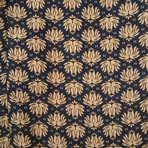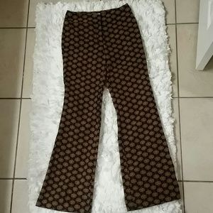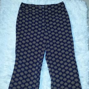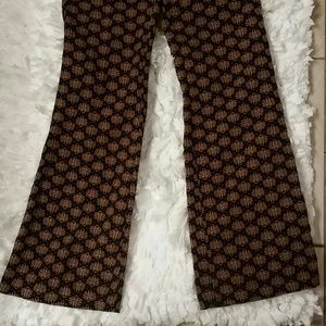 Navy blue and golden brown flowy pants. Bought them without trying them on and they were a bit thigh. They are very cute on. Bell bottoms.
