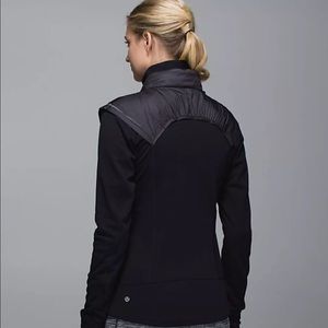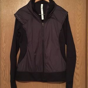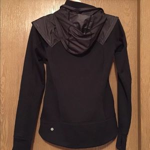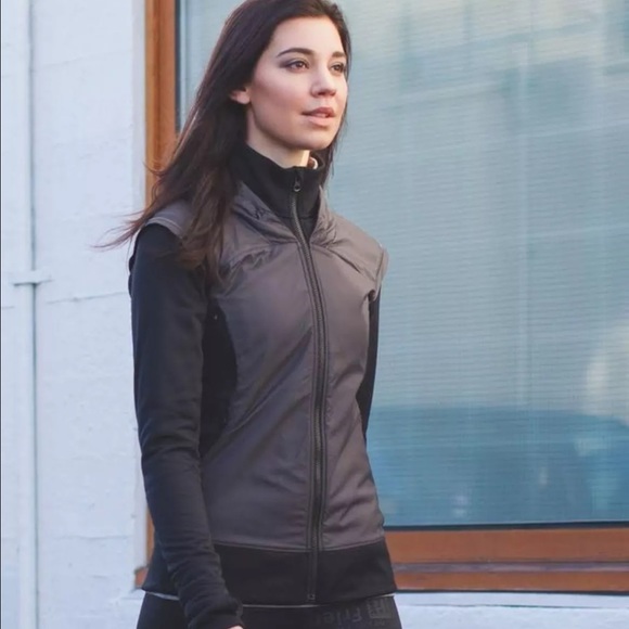 100% authentic brilliant snug sprinter jacket. Reflectors on edge of shoulder lining, retractable hood, iPod cord so as not to get tangled while running, thumb holes. Totally flattering.