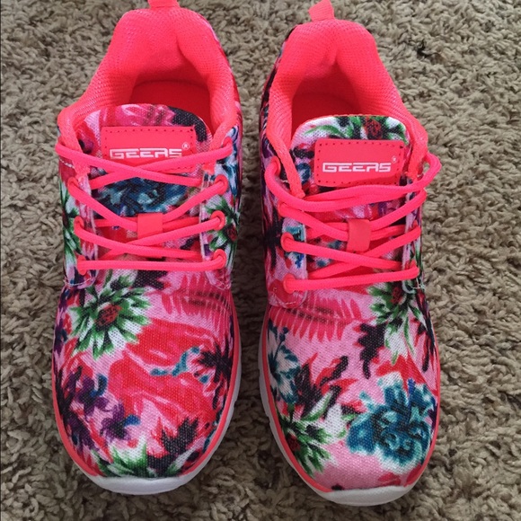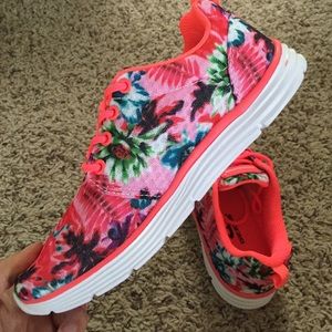 Cute floral pattern mesh. Shoe is lined 100%. Pink is bright neon pink for trim and laces.