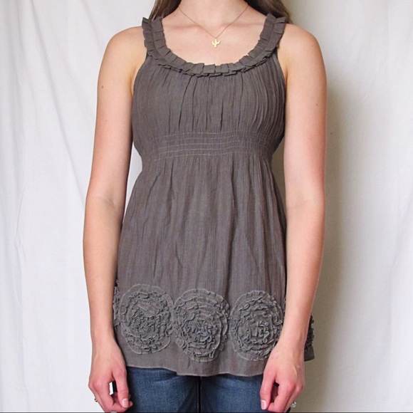 This tank top is pre owned, but in great condition! The material is very light weight and perfect for summer days. The bottom hem (pictured) has flowers made of matching material.