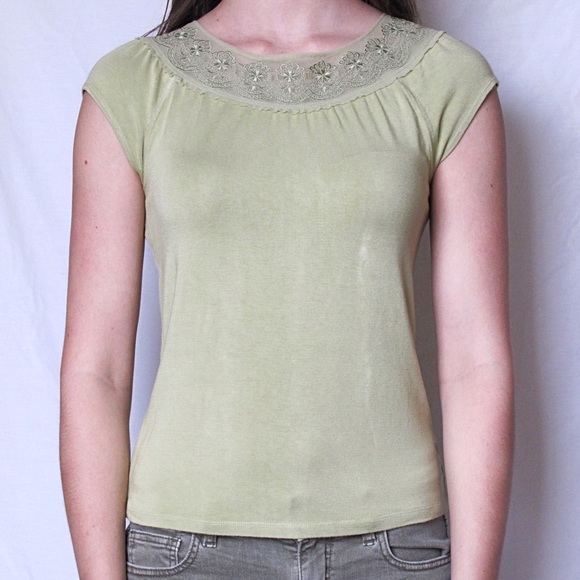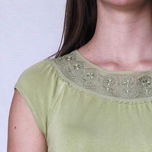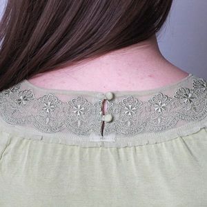 This lovely top features a light weight material in green with matching lace along the neckline. The fit is perfect for skirts and pants alike. It is previously owned, but does not contain holes or stains.