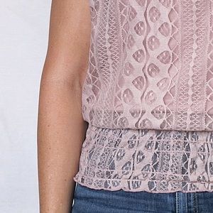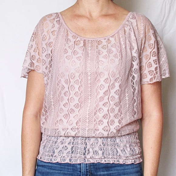 This lace top looks great with pants and skirts alike. The waist band is stretchy, which is not only comfortable but also creates a nice silhouette. This top is pre owned, but still in great condition! No stains or tears.