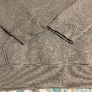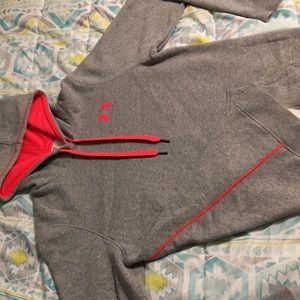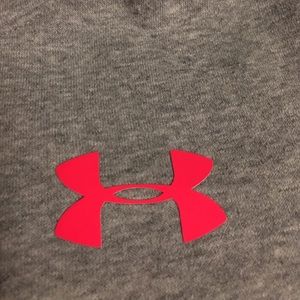 Under Armour All Season Gear Sweatshirt, semi-fitted, size medium, lighter gray in color with a vibrant coral color (mesh inner lining of hood, hood strings, UA symbol, stitching down both sides and on shoulders)