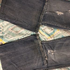 Silver Jeans, "Frances" fit, low-rise with a lighter wash, size 30"W x 33"L, very stretchy and therefore extremely comfortable! (: The third picture shows a section of the intentional distressed look but in the middle of the two holes the fabric no longer attached in the very small spot they were when they were bought-- I never messed with it because it looks fine with the jeans on. Definitely one of the most comfortable pairs of jeans I've ever owned they're just too big for me