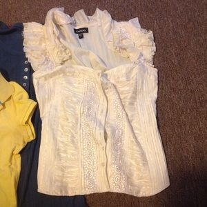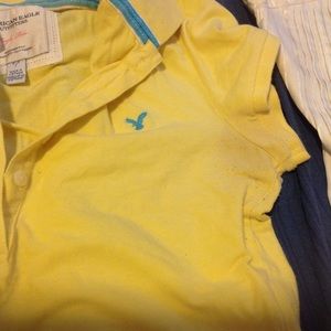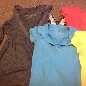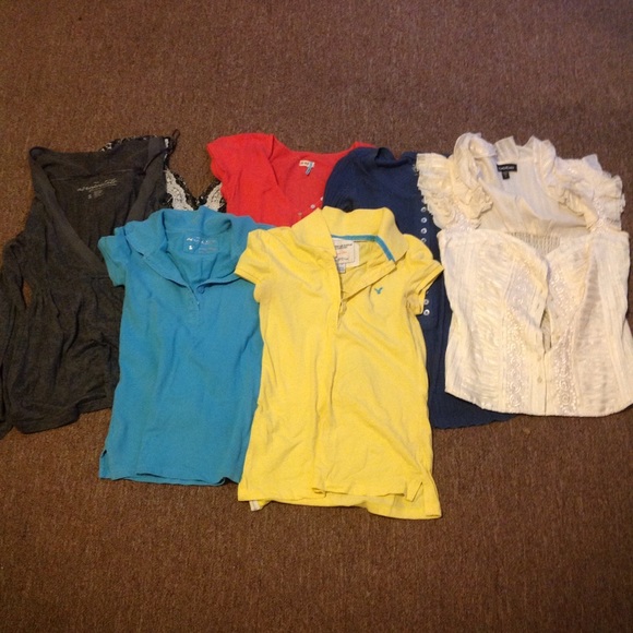 Pre-owned tops: size small gray Aeropostale hoodie with sheer pattern insets; blue size small Aeropostale polo; yellow size small American Eagle polo with some pilling and slight discoloration as pictured; sun moon star size medium sheer paisley and lace top; orange size small Old Navy waffle Henley; blue size medium Energie ribbed Henley; and size medium white striped ruffle blouse from Bebe.