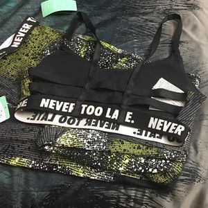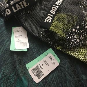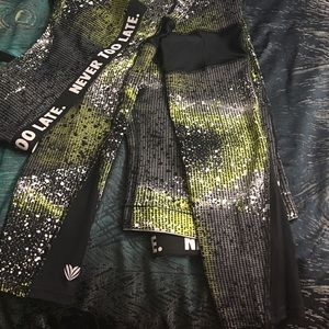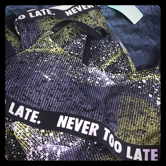 Never worn, lime green, black and white splash color design, stretchy material, "Never Too Late" along band, matching top and bottoms, ventilation at knees. Please ask if any further questions!