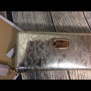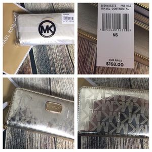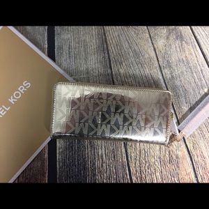 New Michael Kors Metallic Signature Jet Set Travel Continental Zip Wristlet/Wallet.