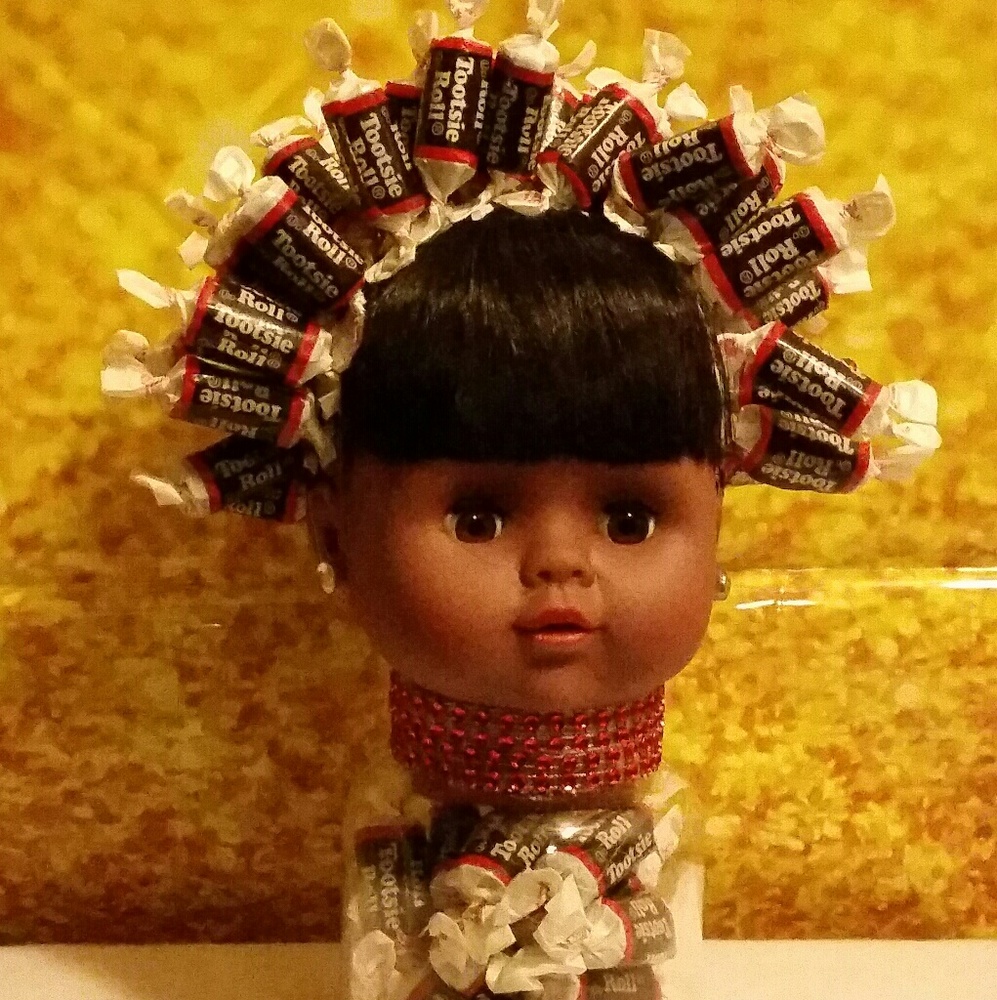 The doll head has tootsie rolls all around it and the jar is filled with Tootsie Rolls