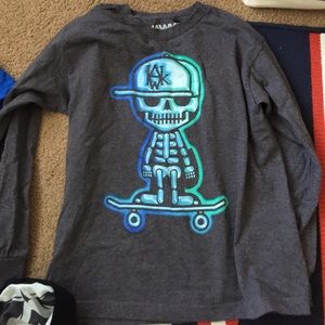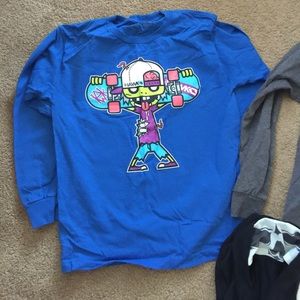 3 long sleeves Tony Hawk shirts in excellent used condition ! The black one has a hood with a mask and the grey on glows in the dark. The royal blue is a awesome bright color with a zombie on it. My son hardly wore these because he doesn't like longsleeve shirts LOL