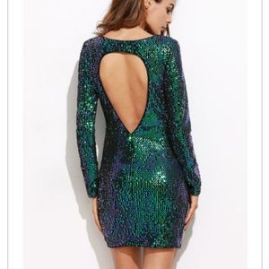 Perfect for a date night or a special occasion this iridescent green open back sequin bodycon dress will turn heads. It features a round neckline, bodycon style silhouette and long sleeves. Please view the description photo for more information.