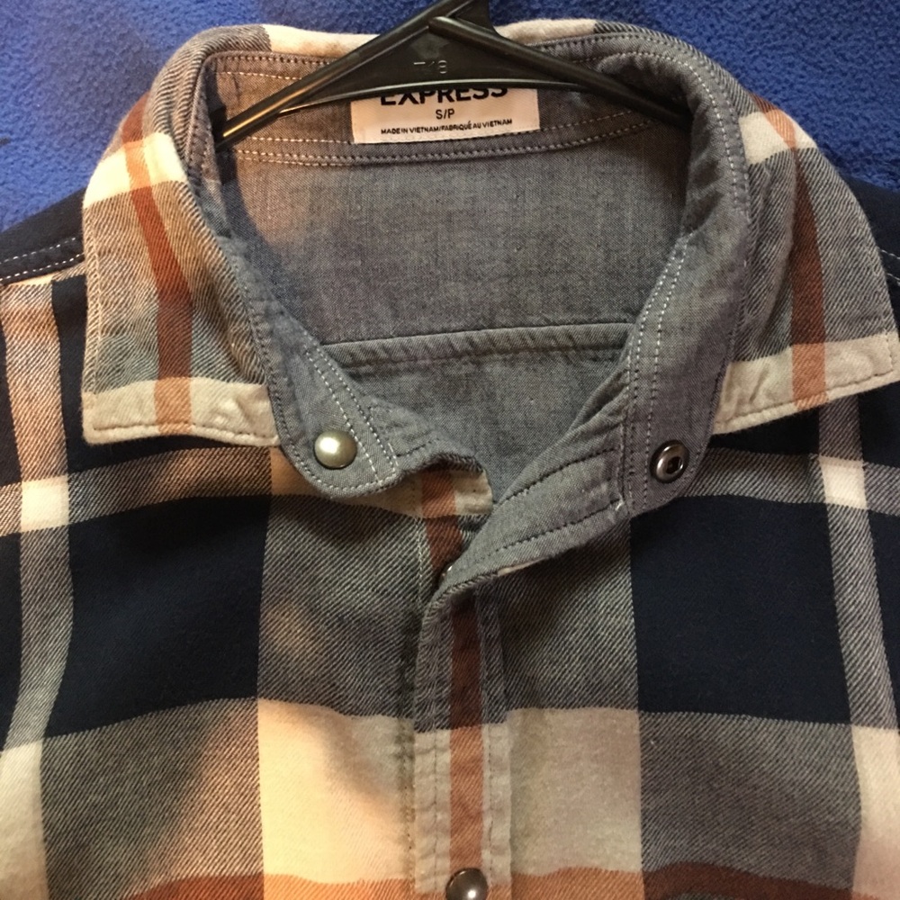 Two shirts for the price of one! One side plaid, one side chambray. Snap front and cuffs. Cotton, washable. This shirt is very comfortable and can fit many different styles. Only worn a couple of times, in great condition.