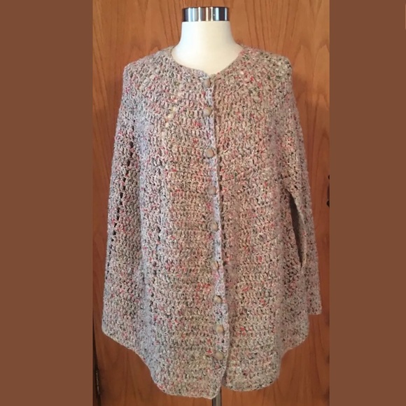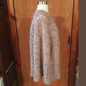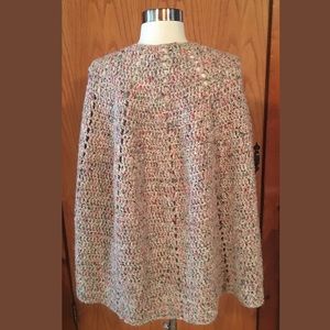 Crochet Knit Multi-Color Button Front Cape Shall One Size Fits Most S-XL. There isn't a size tag but should fit most sized S-XL. There isn't a material tag, feels to be a cotton blend.