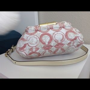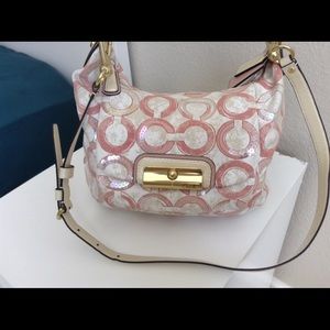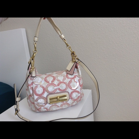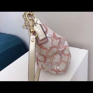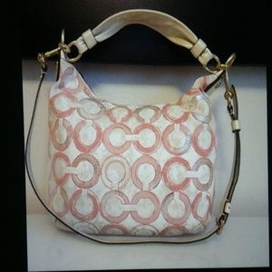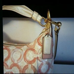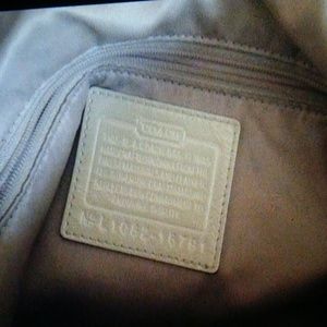 Like New condition. No tears or scratches or even wear signs. May be some storage signs in the handles. I bought the purse from here and never used it. The purse is gorgeous and still have the Authentic Coach card on. It just needs another good home.