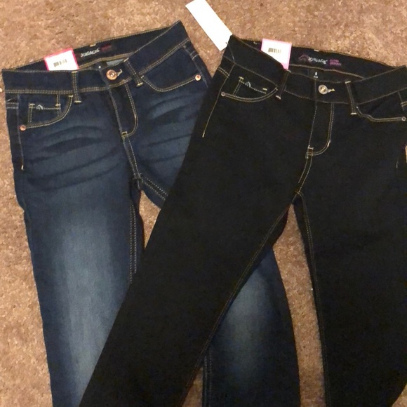 One is a dark jean color and the other is a denim color. Never worn size 8 in girls 💕