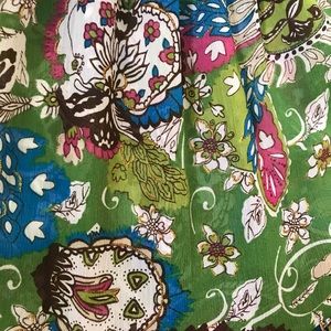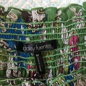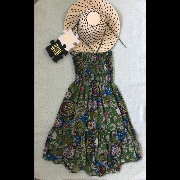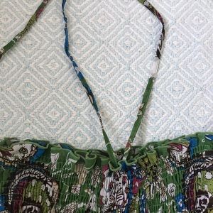 Sheer green and paisley halter dress/top. Straps can be tucked in for strapless wear. Vibrant accent colors with a gold detail. Ruffle at the bottom. Stretch tube at the chest.