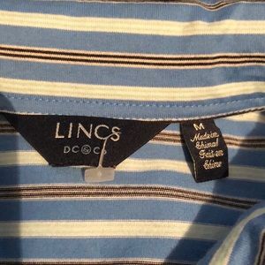 Striped blue polo, never warn. Hubby doesn't like this shirt. Purchased at JoS. A. Bank Condition 10/10