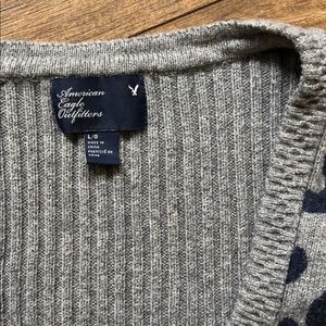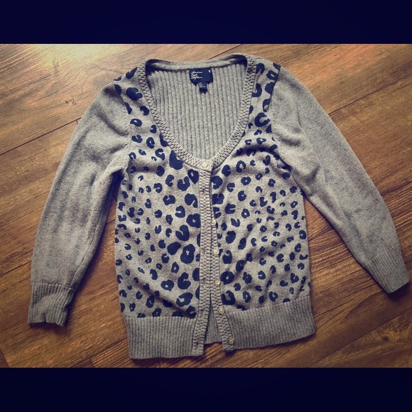 Gray cardigan w/navy blue leopard print! Super soft and comfy, great shape! Looks great dressed up or casual.