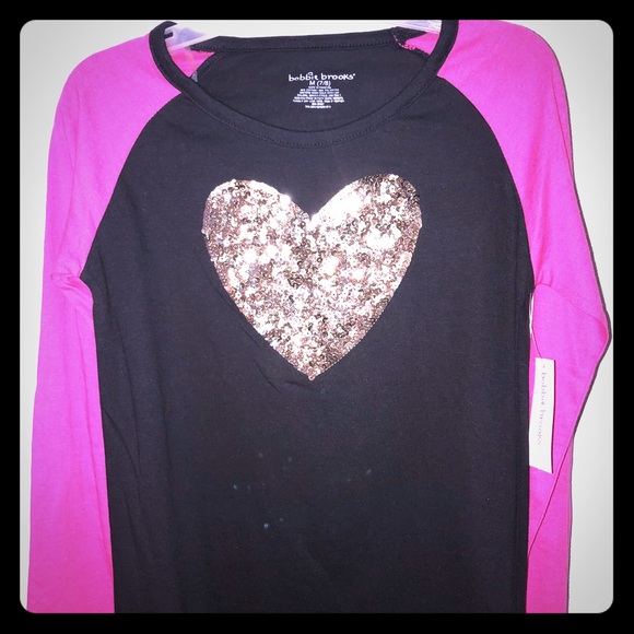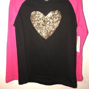 Adorable Gold Heart Appliqué Black & Pink Long Sleeve. 60% Cotton 40% Polyester. Machine washable. Size Medium 7/8.