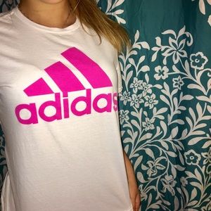 This adidas tee is simple but easily paired with about anything! The shirt is in very good condition, it does fit small for a medium. It’s pre-loved so it does have pic in the material. The pic is very minor and on the side of the shirt as you see in the picture. LOTS of life left in this shirt!!💕