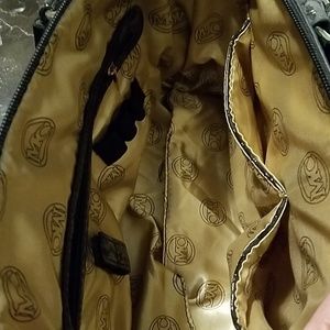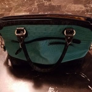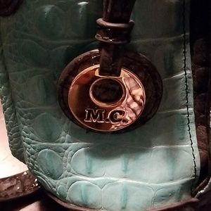 Lightly used MC handbag with beautiful croc leather. This bag is charcoal grey trimmed with an elegant turquoise body. No signs of wear.