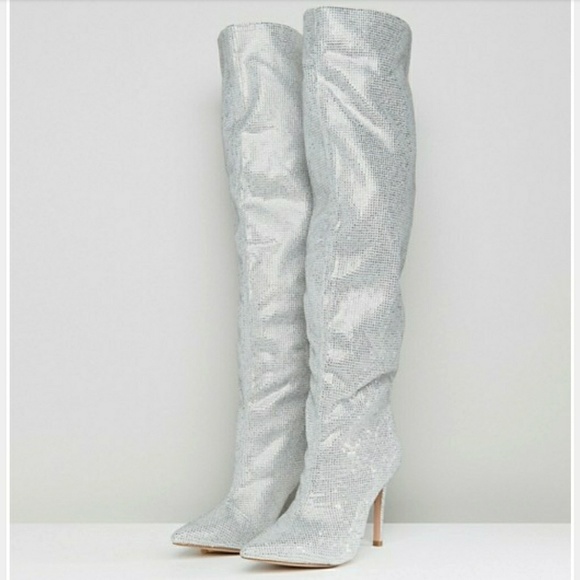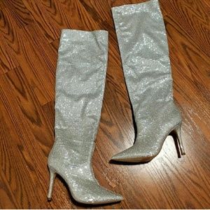 Pointed toe silver knee high heel stilleto rhinestone booties! Show shopper. Glitters so much in the light. Comfortable to walk in.