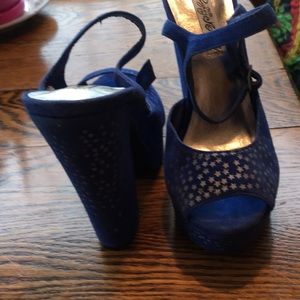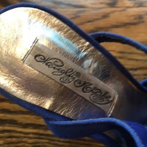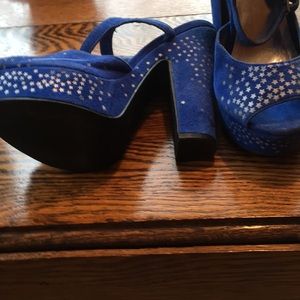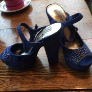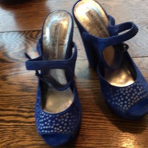 Very cool vintage platform shoes by Naughty Monkey. Blue suede with silver stars. Buckle strap. Peep toe. S 8.5 Med. 5 1/2” heel. Nice condition. Preowned